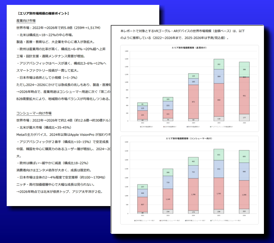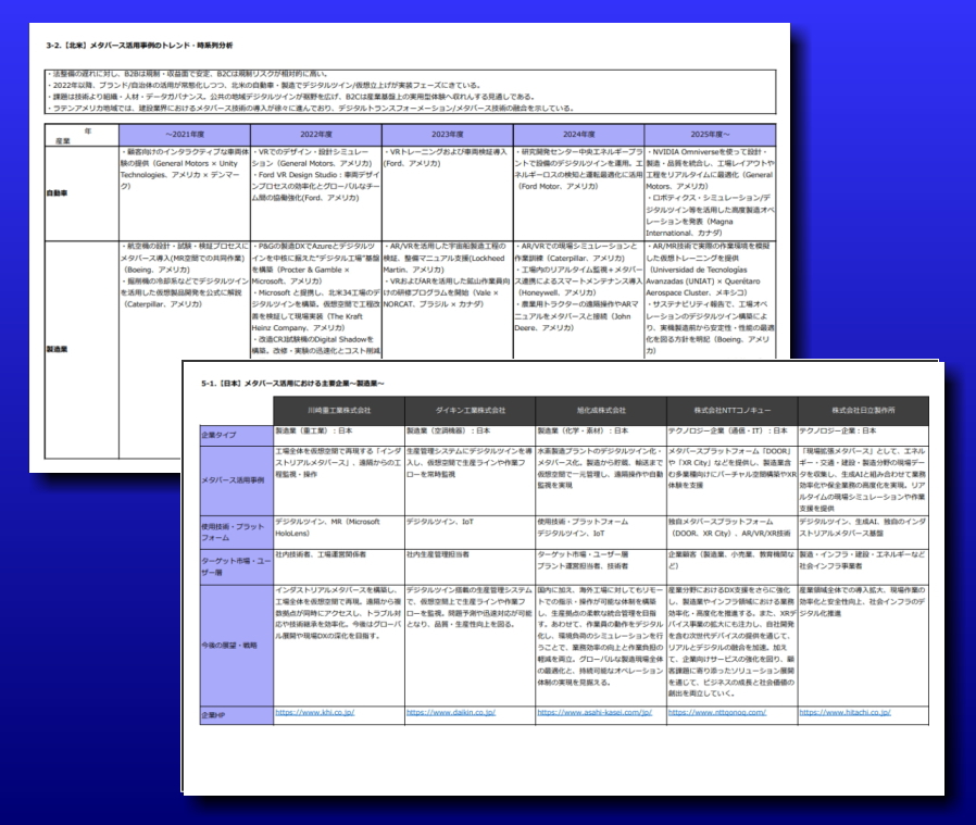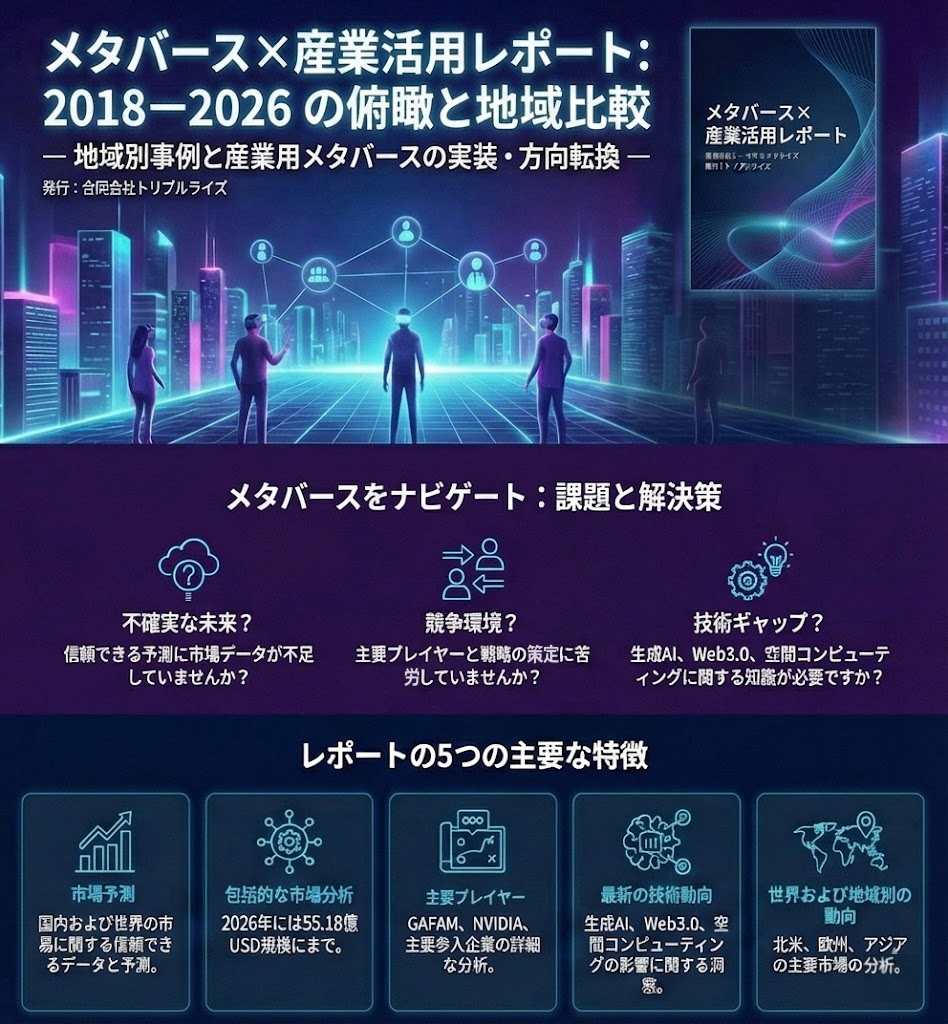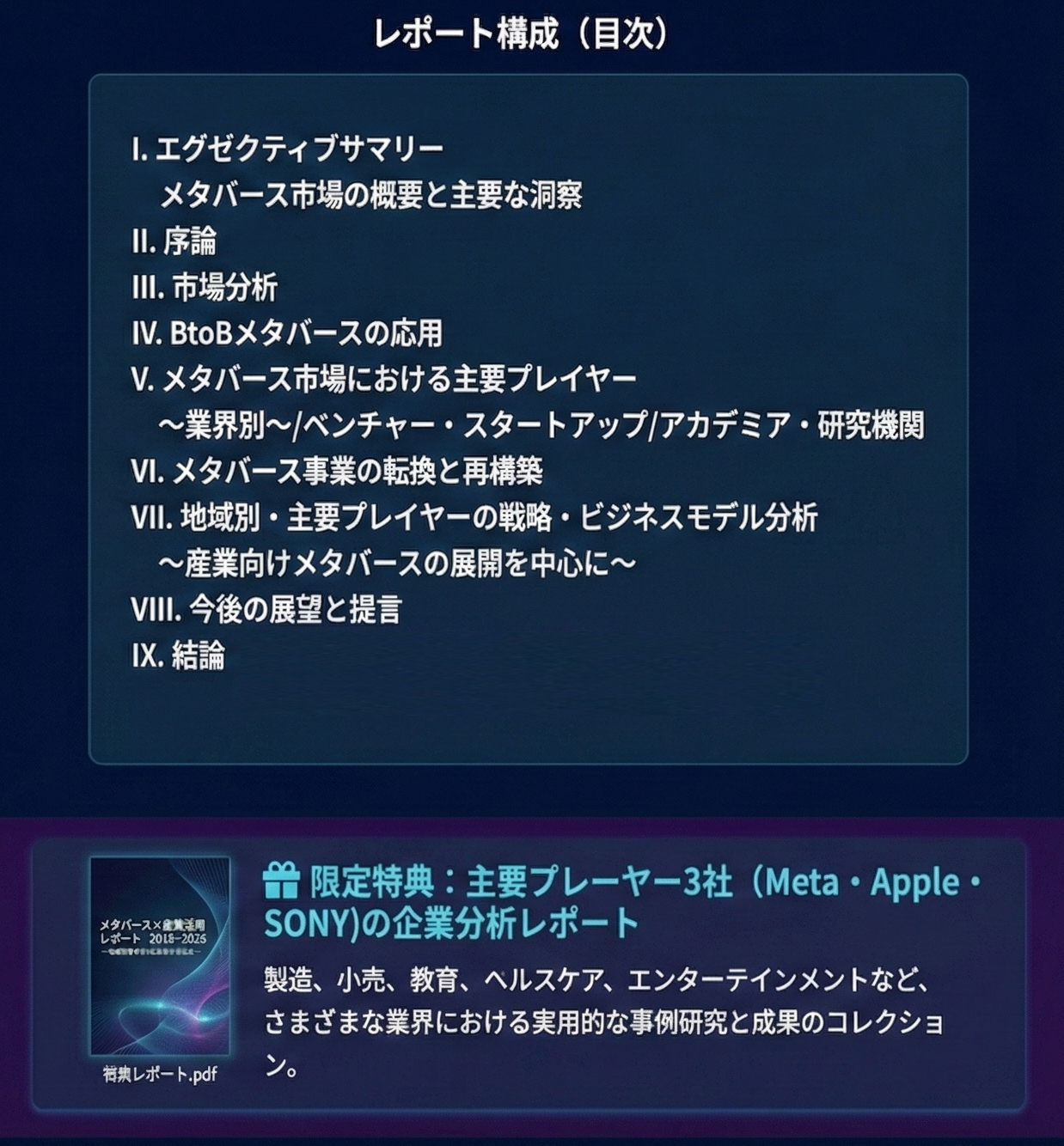 北米(Meta、Appleなどによる全方位的な発展と市場主導性)、欧州(産業用PoCの多さとIndustry 4. 0との融合)、アジアパシフィック(市場規模の縮小傾向と産業用途への集中)といった地域ごとの市場特性を比較分析。 その中でも、日本市場では、北米や中国と比較して中規模ながら、世界有数のゲーム‧アニメ産業やVTuber文化の発達により独自の発展を遂げていることが確認されています。 また、BtoB分野において、デジタルツインによる製造業の効率化(旭化成、ダイキン工業)、遠隔訓練(メディカロイド)、そして不登校児童への学習支援(大日本印刷)など、実用性の高い活用事例を多数紹介。 それら成功事例の分析から、本レポートではその共通項やパートナーシステムの構築について考察をしております。 |